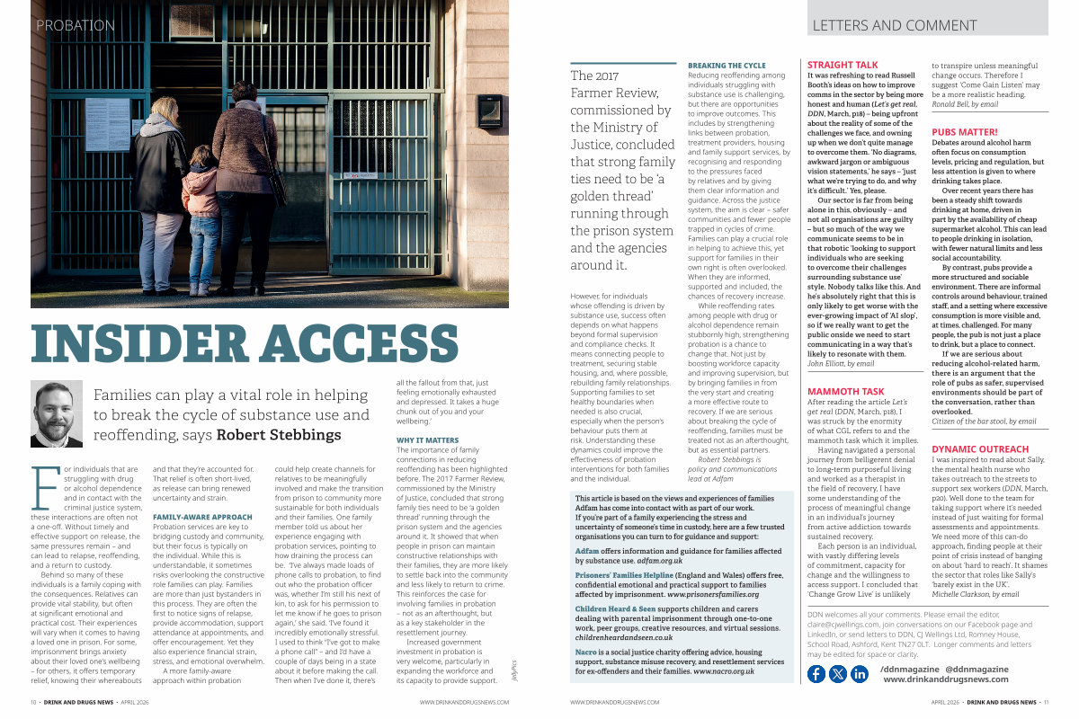 BREAKING THE CYCLE Reducing reoffending among individuals struggling with substance use is challenging, but there are opportunities to improve outcomes. This includes by strengthening links between probation, treatment providers, housing and family support services, by recognising and responding to the pressures faced by relatives and by giving them clear information and guidance. Across the justice system, the aim is clear – safer communities and fewer people trapped in cycles of crime. Families can play a crucial role in helping to achieve this, yet support for families in their own right is often overlooked. When they are informed, supported and included, the chances of recovery increase.