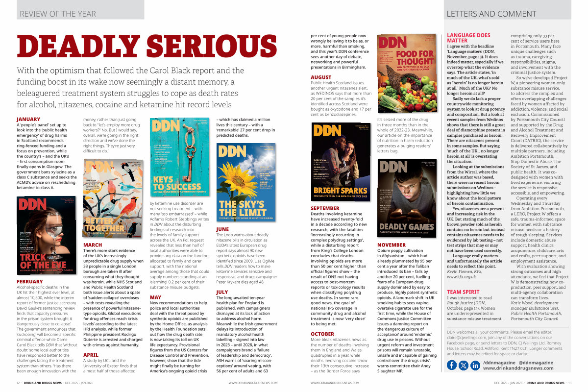 A‘ people’ s panel’ set up to look into the‘ public health emergency’ of drug harms in Scotland recommends ring-fenced funding and a focus on prevention, while the country’ s – and the UK’ s – first consumption room finally opens in Glasgow. The government bans xylazine as a class C substance and seeks the ACMD’ s advice on rescheduling ketamine to class A.