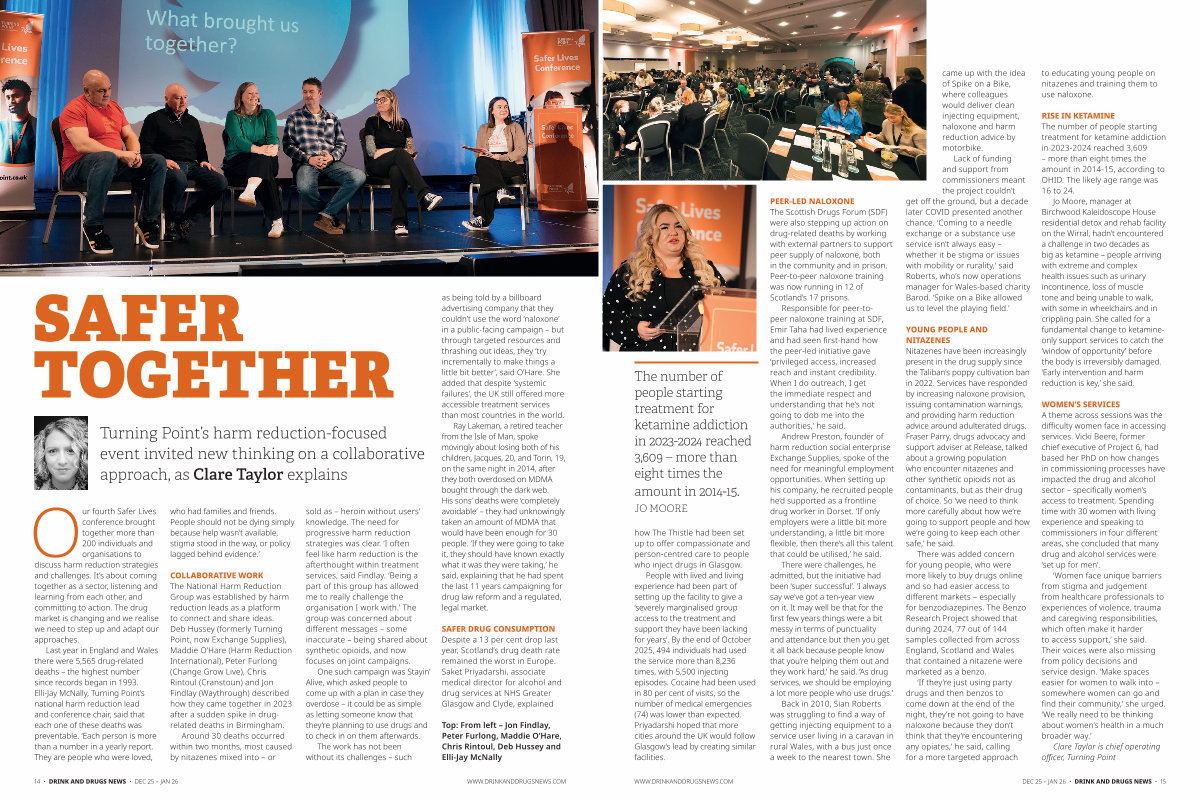 YOUNG PEOPLE AND NITAZENES Nitazenes have been increasingly present in the drug supply since the Taliban’ s poppy cultivation ban in 2022. Services have responded by increasing naloxone provision, issuing contamination warnings, and providing harm reduction advice around adulterated drugs. Fraser Parry, drugs advocacy and support adviser at Release, talked about a growing population who encounter nitazenes and other synthetic opioids not as contaminants, but as their drug of choice. So‘ we need to think more carefully about how we’ re going to support people and how we’ re going to keep each other safe,’ he said.