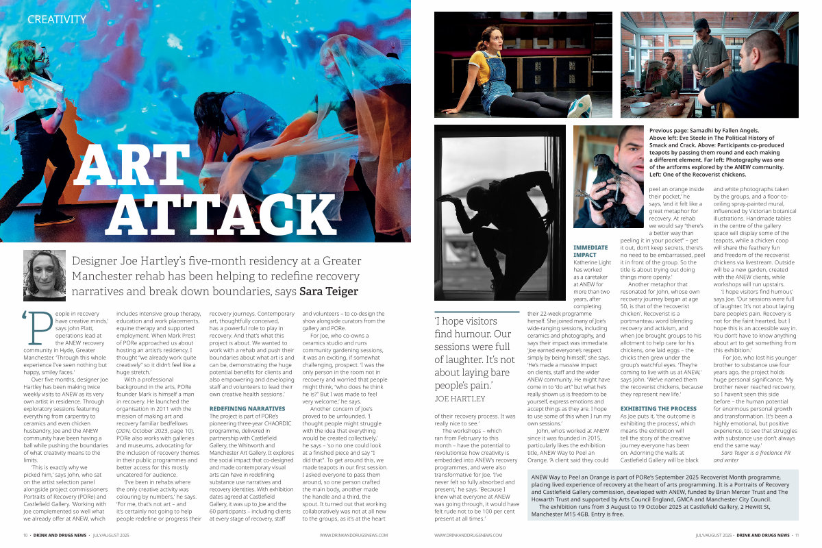 The workshops – which ran from February to this month – have the potential to revolutionise how creativity is embedded into ANEW’ s recovery programmes, and were also transformative for Joe.‘ I’ ve never felt so fully absorbed and present,’ he says.‘ Because I knew what everyone at ANEW was going through, it would have felt rude not to be 100 per cent present at all times.’
