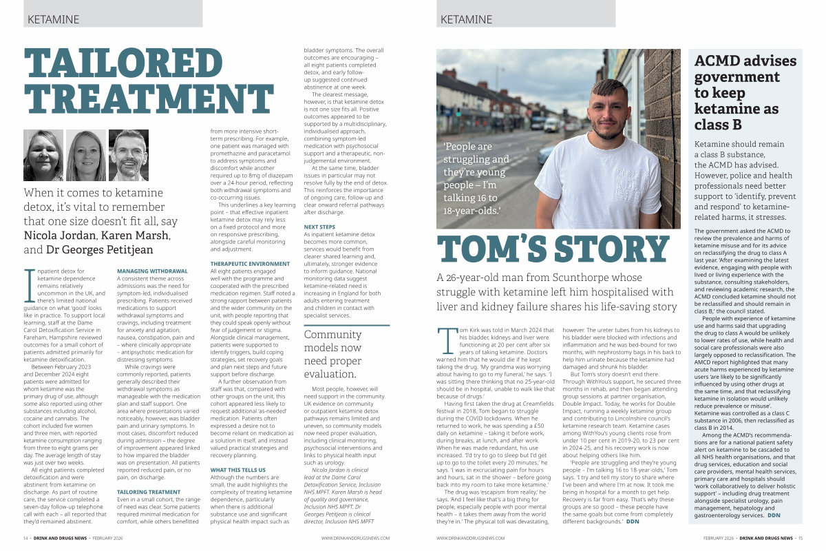 Among the ACMD’ s recommendations are for a national patient safety alert on ketamine to be cascaded to all NHS health organisations, and that drug services, education and social care providers, mental health services, primary care and hospitals should‘ work collaboratively to deliver holistic support’ – including drug treatment alongside specialist urology, pain management, hepatology and gastroenterology services. DDN