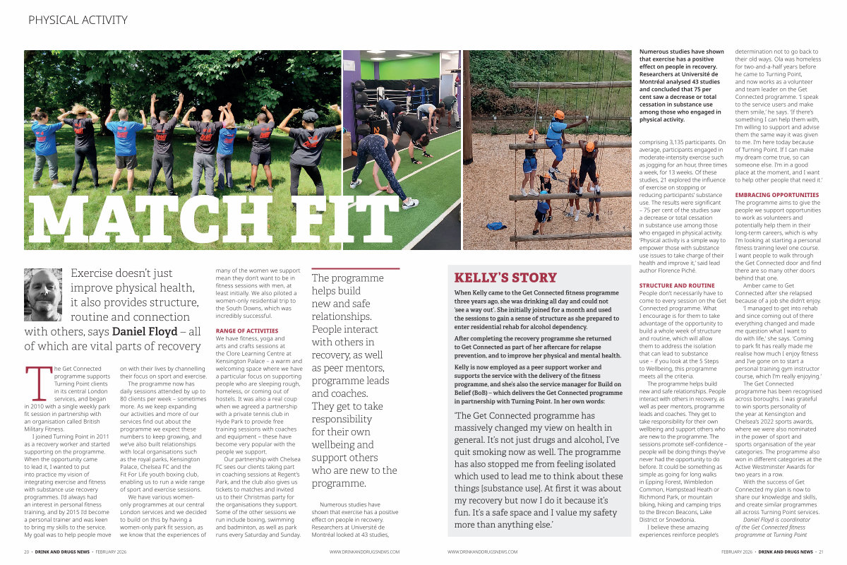 I joined Turning Point in 2011 as a recovery worker and started supporting on the programme. When the opportunity came to lead it, I wanted to put into practice my vision of integrating exercise and fitness with substance use recovery programmes. I’ d always had an interest in personal fitness training, and by 2015 I’ d become a personal trainer and was keen to bring my skills to the service. My goal was to help people move on with their lives by channelling their focus on sport and exercise. The programme now has daily sessions attended by up to 80 clients per week – sometimes more. As we keep expanding our activities and more of our services find out about the programme we expect these numbers to keep growing, and we’ ve also built relationships with local organisations such as the royal parks, Kensington Palace, Chelsea FC and the Fit For Life youth boxing club, enabling us to run a wide range of sport and exercise sessions. We have various womenonly programmes at our central London services and we decided to build on this by having a women-only park fit session, as we know that the experiences of many of the women we support mean they don’ t want to be in fitness sessions with men, at least initially. We also piloted a women-only residential trip to the South Downs, which was incredibly successful.