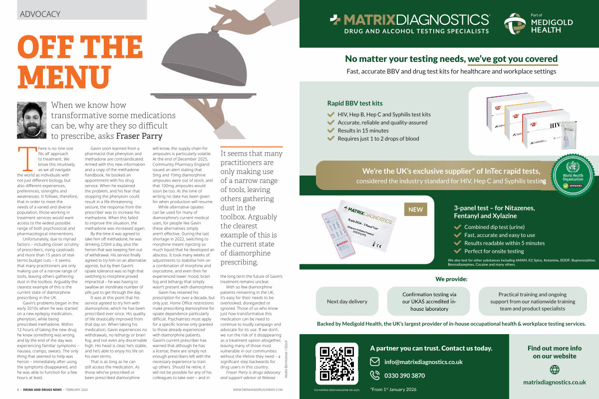 There is no‘ one size fits all’ approach to treatment. We know this intuitively, as we all navigate the world as individuals with not just different biology, but also different experiences, preferences, strengths and weaknesses. It follows, therefore, that in order to meet the needs of a varied and diverse population, those working in treatment services would want access to the widest possible range of both psychosocial and pharmacological interventions. Unfortunately, due to myriad factors – including closer scrutiny of prescribers, rising caseloads and more than 15 years of realterms budget cuts – it seems that many practitioners are only making use of a narrow range of tools, leaving others gathering dust in the toolbox. Arguably the clearest example of this is the current state of diamorphine prescribing in the UK.