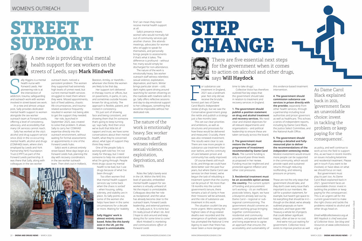 S ally Higgins is a mental health nurse with Forward Leeds. Her pioneering role is at the intersection of addiction, trauma, safeguarding and outreach work with women involved in street-based sex work.