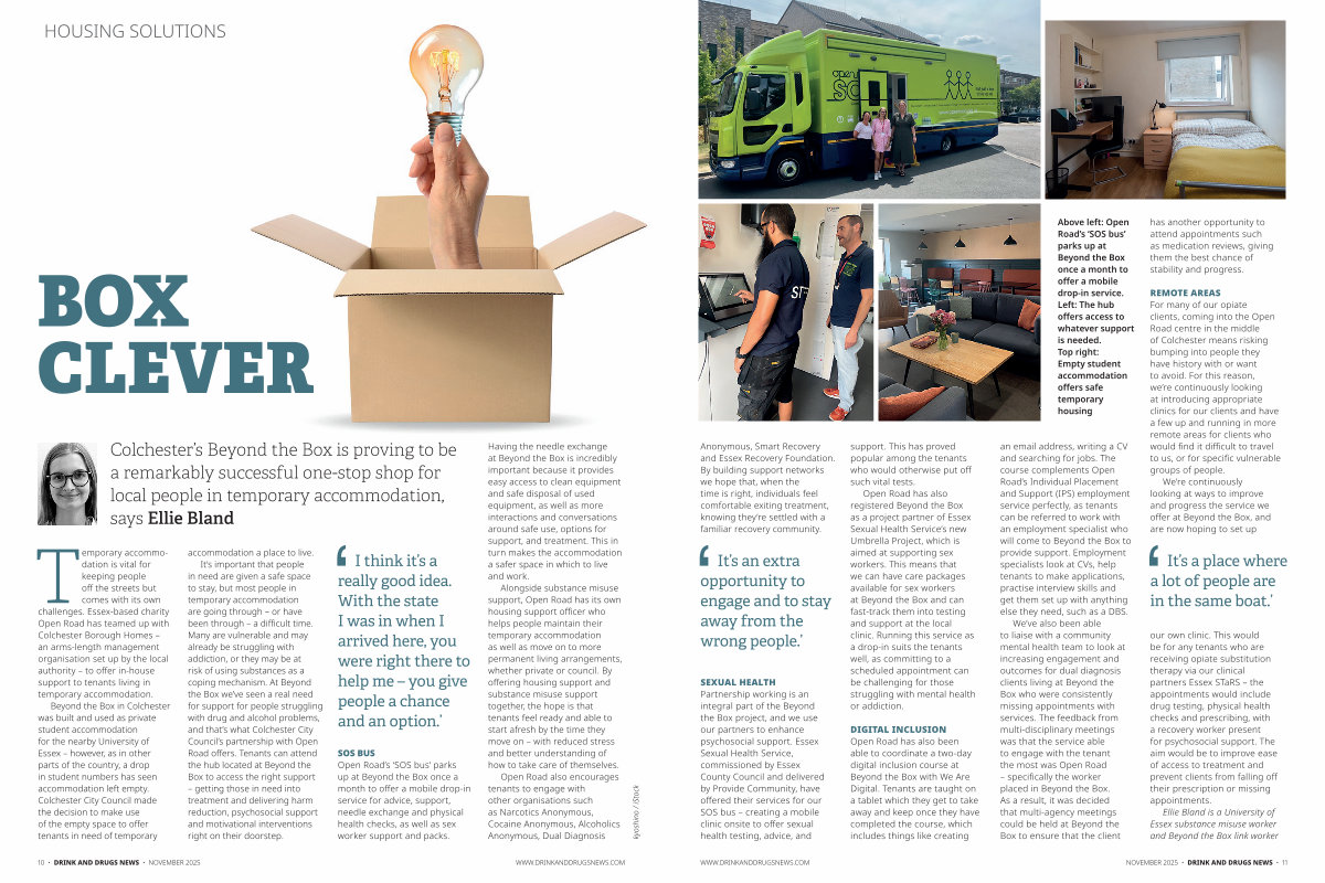 SEXUAL HEALTH Partnership working is an integral part of the Beyond the Box project, and we use our partners to enhance psychosocial support. Essex Sexual Health Service, commissioned by Essex County Council and delivered by Provide Community, have offered their services for our SOS bus – creating a mobile clinic onsite to offer sexual health testing, advice, and