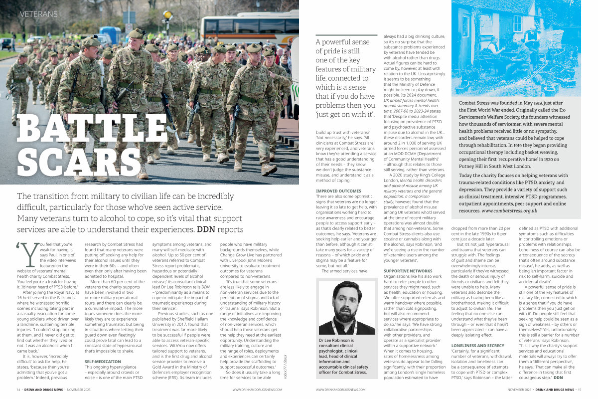 symptoms among veterans, and many will self-medicate with alcohol.‘ Up to 50 per cent of veterans referred to Combat Stress report problematic, hazardous or potentially dependent levels of alcohol misuse,’ its consultant clinical lead Dr Lee Robinson tells DDN –‘ predominantly as a means to cope or mitigate the impact of traumatic experiences during their service’.