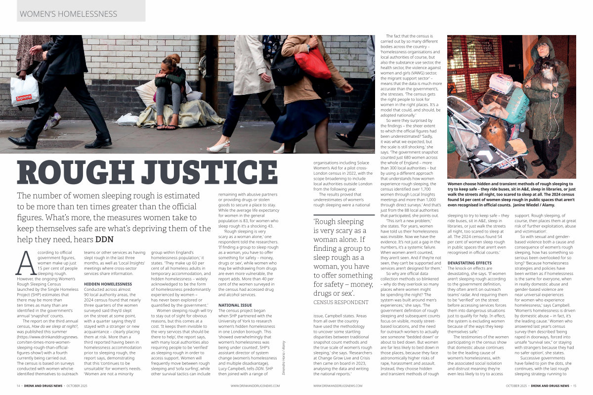 HIDDEN HOMELESSNESS Conducted across almost 90 local authority areas, the 2024 census found that nearly three quarters of the women surveyed said they’ d slept on the street at some point, with a quarter saying they’ d stayed with a stranger or new acquaintance – clearly placing them at risk. More than a third reported having been in homelessness accommodation prior to sleeping rough, the report says, demonstrating that this‘ continues to be unsuitable’ for women’ s needs.‘ Women are not a minority group within England’ s homelessness population,’ it states.‘ They make up 60 per cent of all homeless adults in temporary accommodation, and hidden homelessness – widely acknowledged to be the form of homelessness predominantly experienced by women – has never been explored or quantified by the government.’