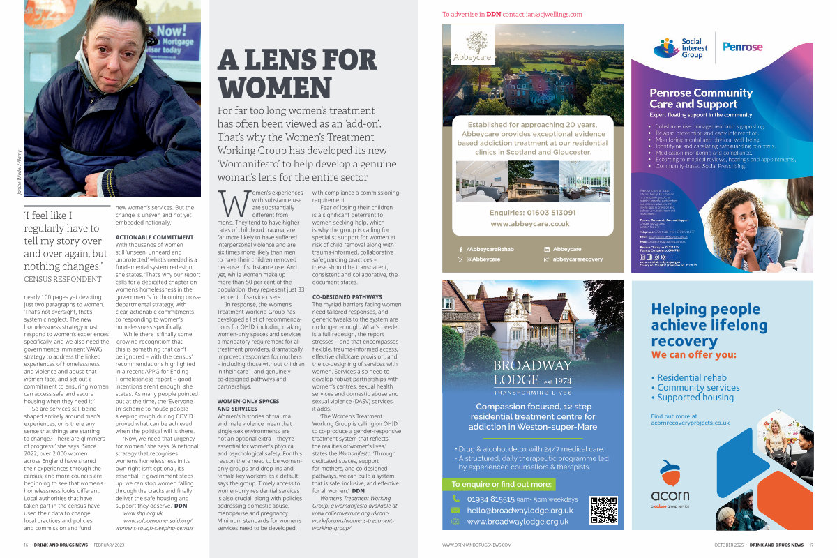 ‘ Now, we need that urgency for women,’ she says.‘ A national strategy that recognises women’ s homelessness in its own right isn’ t optional, it’ s essential. If government steps up, we can stop women falling through the cracks and finally deliver the safe housing and support they deserve.’ DDN www. shp. org. uk www. solacewomensaid. org / womens-rough-sleeping-census