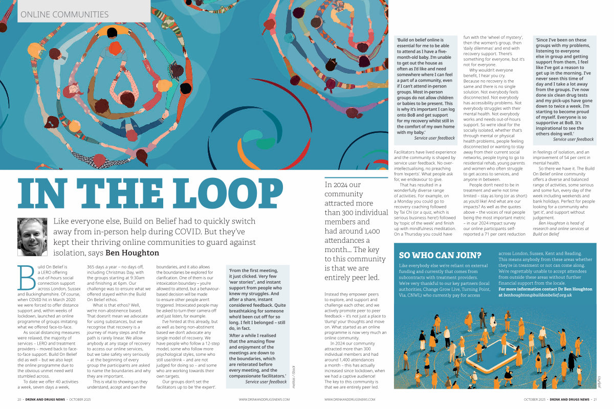 ‘ Build on belief online is essential for me to be able to attend as I have a fivemonth-old baby. I’ m unable to get out the house as often as I’ d like and need somewhere where I can feel a part of a community, even if I can’ t attend in-person groups. Most in-person groups do not allow children or babies to be present. This is why it’ s important I can log onto BoB and get support for my recovery whilst still in the comfort of my own home with my baby.’