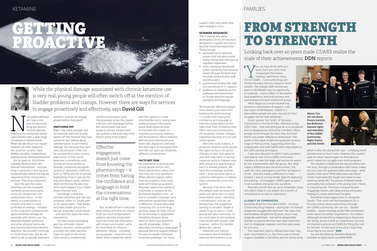 FACTS NOT FEAR My experience of working with young people mirrors this. When offered facts rather than fear, they ask more questions. When offered support rather than assumptions, they come back with follow-up questions. Recently I spent time talking to individuals in recovery at the Birchwood Inpatient Unit – all had a consistent message: early intervention would have made a difference. Several described contacting GPs or local drug services, eager for help, only to be turned away or signposted elsewhere because those services didn’ t have ketaminespecific knowledge. Others described choosing to disengage because the only support offered focused on opiate-orientated treatment pathways. For many,