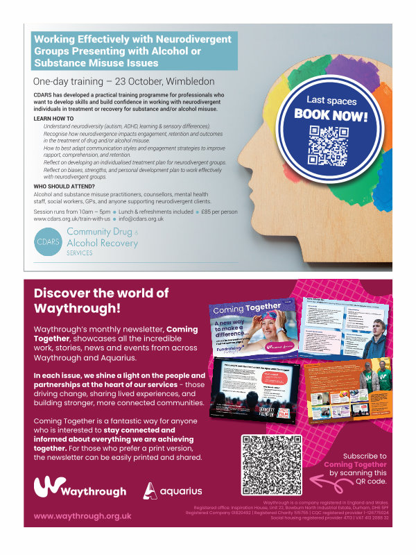WHO SHOULD ATTEND? Alcohol and substance misuse practitioners, counsellors, mental health staff, social workers, GPs, and anyone supporting neurodivergent clients.