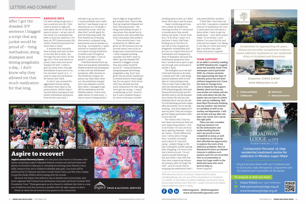 Three months later I was arrested for an offence and given an IPP sentence, but my journey wasn’ t over as far as drugs were concerned because I never stopped smoking cannabis and didn’ t want to. After I got the dreaded IPP sentence I blagged a script that any junkie would be proud of – 70mg methadone, 30mg diazepam and 600mg pregabalin a day. And I was given this by prison healthcare in several prisons every single day for ten years! I don’ t know why they allowed me that much medication for that long. Don’ t get me wrong – I wasn’ t complaining, in fact I loved it, but it was a reckless thing to do; more so because I started