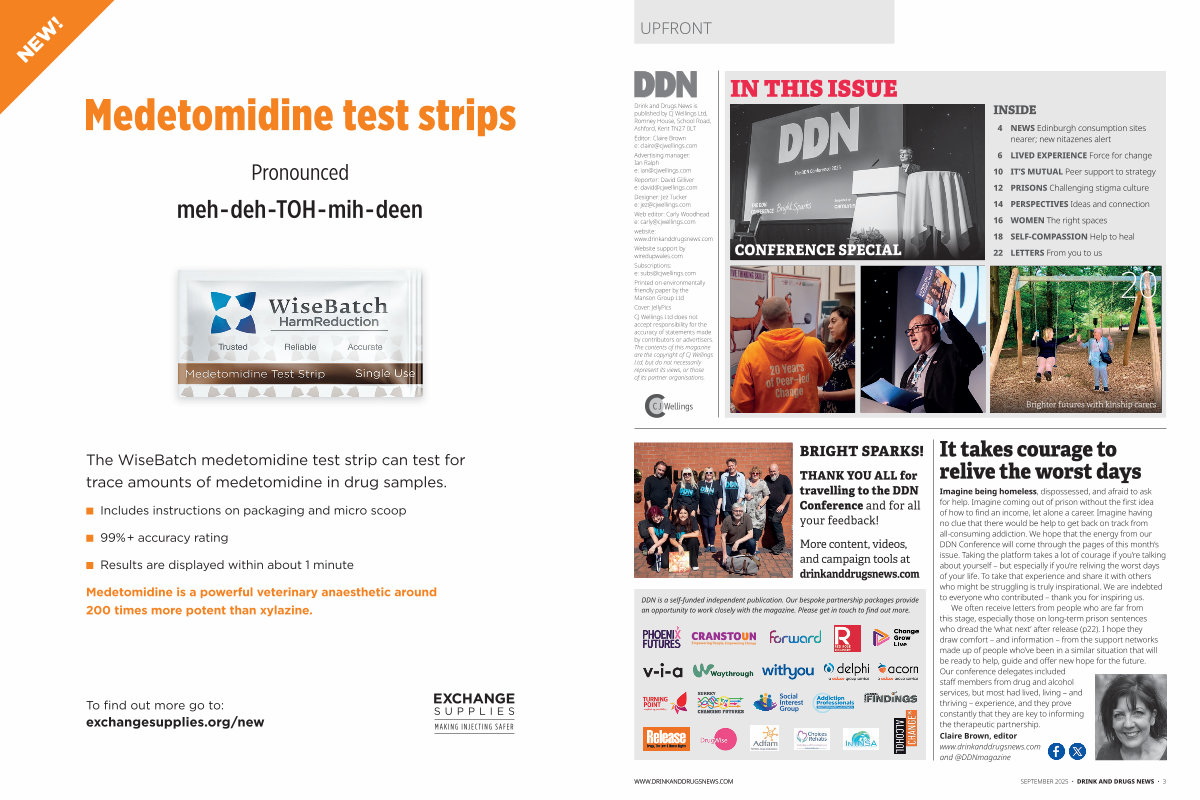 We often receive letters from people who are far from this stage, especially those on long-term prison sentences who dread the‘ what next’ after release( p22). I hope they draw comfort – and information – from the support networks made up of people who’ ve been in a similar situation that will be ready to help, guide and offer new hope for the future. Our conference delegates included staff members from drug and alcohol services, but most had lived, living – and thriving – experience, and they prove constantly that they are key to informing the therapeutic partnership. Claire Brown, editor www. drinkanddrugsnews. com and @ DDNmagazine