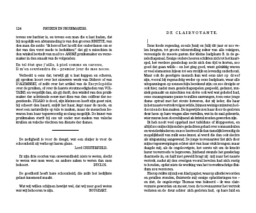 Eene koele regendag, zooals Junij en Julij dit jaar er zoo ve- len bragten, tot groote teleurstelling zeker van alle reizigers, vereenigde de meeste gasten der kleine badplaats B. in de ge-zelschapszaal. Eenige oudere heeren schikten zich tot het kaart-spel, het verdere gezelschap zocht zich den tijd te korten, zoo goed dat gaan wilde – en het ging goed, want gelukkig waren er veel elementen bijeen tot een vrolijk en levendig onderhoud. Maar ook de geestigste mensch kan wel eens niet op dreef zijn, vooral bij regenachtig weder op eene badplaats, waar alle uitspanningen op zonneschijn berekend zijn; en zoo dreigde er ook hier, nadat men gezelschapsspelen gespeeld, gedanst, mu-ziek gemaakt en misschien ten slotte ook wel wat geheled had, eene onaangename pauze te zullen aanvangen, toen eene jonge dame optrad met het stoute beweren, dat zij ieder, die haar in het naaste vertrek volgen wilde, binnen weinige minuten hel-derziende kon maken. De ingewijde zou haar door de gesloten deur heen op hare vragen alles vertellen, wat in de zaal gebeurde, wier muren hem doorschijnend als kristal zouden geworden zijn.