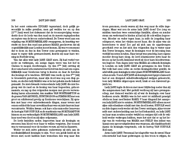 Van dat alles wist lady JANE GRAY niets. Zij had verlof ver-zocht en verkregen, om eenige dagen verre van het hof in Chelsea te mogen doorbrengen. Op den 9den Julij ontving zij door eene harer schoonzusters het bevel van den raad om oogen-blikkelijk naar Sionhouse terug te keeren en daar de bevelen des konings af te wachten. EDUARD was reeds op den 6den Julij te Greenwich gestorven, maar zijn dood was nog een diep ge-heim, en slechts lady MARIA was er in het geheim mede bekend gemaakt. De niets kwaads vermoedende lady JANE die niet be-greep wat de raad en de koning van haar begeerden, gehoor-zaamde, en zag op den volgenden morgen met groote verwon-dering haren schoonvader, den markies VAN NORTHAMPTON en de graven VAN ARUNDEL, HUNTINGDON en PEMBROKE met een groot en schitterend gevolg op Sionhouse verschijnen. Zij spra- ken met haar over onbeteekenende dingen, maar tevens met eenen eerbied die haar onverklaarbaar was en juist daarom haar verontrustte. Weldra kwam ook hare schoonmoeder benevens de hertogin VAN SUFFOLK en de markiezin van NORTHAMPTON binnen en nu verkondigde NORTHUMBERLAND aan lady JANE: haar neef was dood en zij zijne erfgename.