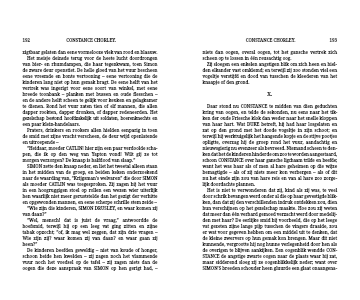 Daar stond nu CONSTANCE te midden van dien geduchten kring van oogen, en telde de sekonden, nu eens naar het tik- ken der oude Friesche klok dan weder naar het snelle kloppen van haar hart. Wat DUKE betreft, hij had haar losgelaten en zat op den grond met het doode vogeltje in zijn schoot; en terwijl hij werktuigelijk het hangende kopje en de stijve pootjes opligtte, overzag hij de groep rond het vuur, aandachtig en nieuwsgierig nu evenzeer als bevreesd. Niemand scheen te den-ken dat het de kinderen hinderde om zoo te worden aangestaard, schoon CONSTANCE over haar gansche ligchaam trilde en beefde; want het was haar als of men al hare geheimen op die wijze bemagtigde – als of zij niets meer kon verbergen – als of dit nu het einde zijn zou van hare reis en van al hare zoo zorge- lijk doordachte plannen.