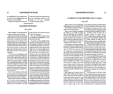 Men zet met de donkerste schakering 112 steken op, en breidt 4 naalden regt; bij elke kleur die gewerkt is, wordt de draad afgeknipt; tweede scha-kering 4 naalden regt, (wij zullen om plaats te winnen naalden met eene en-kele n. en schakering met schak. be-schrijven) derde schak. 4 n. regt.