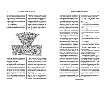 werkt nu het bovenste van den kaper even als de pelerine in point de diamant. In die steek welke men van de voering op de naald gehouden heeft breidt men nu 2 steken, en meerderd in het vervolg bij elken toer een steek, zoo als men bij de voering telkens een steek gemin-derd heeft. Tevens moet de laatste steek van elken toer in de overeenkomende kant of zijsteek van de voering gewerkt worden; zoodat voering en bovengedeelte hierdoor aan elkander verbonden wor-den. Na voleinding van den 16den toer breidt men de steken welke op de beide naalden gebleven zijn weder mede; ver-der minderd men even zoo vele steken aan de beide zijden als men aan de voe-ring gemeerderd heeft, doch in het mid-den worden die 6 steken niet geminderd. Na het einde van den 64sten toer boven de punt, moet het overtrek 36 steken tellen en even lang als de voering we-zen. Men kant niet te los af en legt voering en overtrek op elkander. Het patroon van dezen kaper, ofschoon ver-kleint, zal ons nu bij het in elkander zetten zeker goed van dienst wezen.