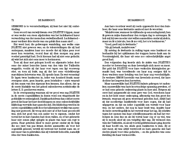 In de overspanning waaraan zij ter prooi was zag JULIËTTE in de eerste oogenblikken in dezen vond een vingermerk der goddelijke voorzienigheid. Dankbaarheid was dan ook het eerste gevoel dat haar het hart deed kloppen en eene onbeschrijfelijke blijfschap vervulde hare gansche ziel. Die blijdschap werd in de eerste oogenblikken zelfs door het allerminste wolkje van aarze-ling niet gestoord. Zij vroeg zich niet af of het haar geoorloofd was, zich het goed van een ander toe te eigenen, omdat het toeval het in hare handen had doen vallen, en of het gebeurde haar niet eenen pligt oplegde in plaats van haar een regt te geven. Haar geweten bleef te meer gerust omdat zij de hulp die zoo juist van pas kwam slechts aanmerkte als voor het oogenblik geleend, terwijl zij terstond het besluit nam om er niet meer van te gebruiken dan zij volstrekt behoefde, namelijk ééne der twee banknoten.