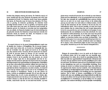 plaats waar overvloed heerscht, bij voorbeeld op eene binnen-plaats met broodkruimels, of op een graanzolder met een gat in het dak, dan verzaakt zij oogenblikkelijk hare gewone matig- heid en eet zich vol en rond. maar tevens is zij edelmoedig genoeg om niet alles voor zich alleen te willen houden, steeds roept zij alle musschen uit den omtrek er bij als zij eens een buitenkansje vindt. Ook is zij zeer gezellig, en niets doet haar meer pleizier dan de ontmoeting van een troepje kameraden boven in een peereboom, met een keuken in het gezigt of eene keukenmeid, die een tafellaken in den tuin uitschudt. Zoo met de anderen te zitten keuvelen, nu en dan eens naar den grond te wippen om een kruimeltje of een stukje aardappel op te pikken, en tusschen beiden eens een klein vechtpartijtje – dat is het grootste genot voor eene musch; terwijl haar grootste ver-driet de kat is, die haar ’s nachts, terwijl zij onder een dakpan zit te slapen, soms onverwacht grijpt en haar doet gaan naar eene plaats, waaruit nog nooit eene musch wedegekeerd is.