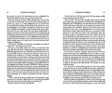 Zij zag op en maakte plaats voor hem, en daar hij moede was, zette hij zich neder, terwijl Ligvoet druipstaartende naar DUKE liep dien hij heel ver verwijderd aan den kant van de ri-vier zag. KRIS nam het scheepje dat aan hare voeten lag, en terwijl hij het bekeek en de zeilen bevestigde, begon hij op nieuw te fluiten, nu niet hard en scherp, maar zacht en gevoelig als wilde hij instemmen met het lied dat de rivier zong en met het zuchten der boomen als de wind hoor hunne jonge, frissche bladeren en krachtige takken henengaat. Ja waarlijk KRIS moet een muzikale ziel hebben, meende CONSTANCE, ofschoon zij hare gedachten niet kon uiten; zij zag hem aan met kinderlijke ver-bazing en bewondering van de bekwaamheid waarmede hij zijn fluiten zoo goed in overeenstemming bragt met het lied der na-tuur, en dit even min verstoorde als de golven met hare rus- teloze beweging of de blaauw hyacinthen met hare uitwase-mingen.