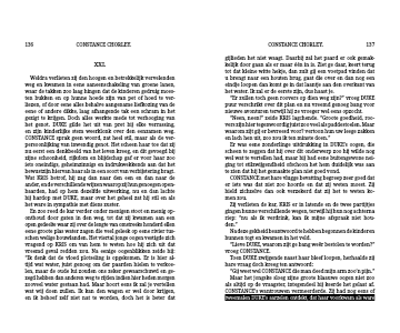 Weldra verlieten zij den hoogen en betrekkelijk vervelenden weg en kwamen in eene aaneenschakeling van groene lanen, waar de takken zoo laag hingen dat de kinderen gedruig moes-ten bukken en op hunne hoede zijn van pet of hoed te ver- liezen, of door eene alles behalve aangename liefkozing van de eene of andere dikke, laag afhangende tak een schram in het gezigt te krijgen. Doch alles werkte mede tot verhooging van het genot. DUKE gilde het uit van pret bij elke verrassing, en zijn kinderlijke stem weerklonk over den eenzamen weg. CONSTANCE sprak geen woord, zat heel stil, maar als de ver-persoonlijking van inwendig genot. Het scheen haar toe dat zij nu eerst een denkbeeld van het leven kreeg, en dit gevoegd bij zijne schoonheid, rijkdom en blijdschap gaf er voor haar zoo iets oneindigs, geheimzinnigs en indrukwekkends aan dat het bewustzijn hiervan haar als in een soort van verbijstering bragt. Wat KRIS betrof, hij zag dan naar den een en dan naar de ander, en de verschillende wijzen waarop zij hun genoegen open-baarden, had op hem dezelfde uitwerking, nu en dan lachte hij hardop met DUKE, maar over het geheel zat hij stil en als het ware in sympathie met diens zuster.
