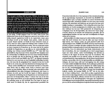 Afschuwelijk is de wijze waarop de edele heldin werd behan-deld. Zij werd verlaten door hen die alles aan haar veschul- digd waren, met valsche eeden om geld gelasterd zelfs door eigen landgenooten. PIERRE CAUCHON, bisschop van Beauvoix, trachtte op haar te wreken dat zijne stadgenooten hem uit zijn kerspel hadden verjaagd nadat de stad was ingenomen door de Franschen. Door de universiteit van Parijs ondersteund, wist hij te bewerken, dat een vormelijk proces werd aangevangen tegen het edele meisje, onder beschuldiging van ketterij en tooverij, in die dagen de kortste weg naar de doodstraf. Wij schuiven een gordijn voor de valsche eeden, de helsche listen en hemeltergende ongeregtigheden, die bij dezen handel plaats hadden, een gordijn ook voor de ligchamelijke en zedelijke mar-telingen, die men haar, zelfs met vertrapping van alle ontzag voor hare jonkvrouwelijke kieschheid, deed ondergaan gedurende de vier maanden, die haar proces duurde. De ontknooping van het lot der eenentwintigjarige heldin eindige daarmede, dat de ongelukkige den 30sten Mei 1431 te Rouaan den brandstapel beklom, zonder dat koning KAREL de VIIde iets in het min- ste tot hare redding deed – eene vlek op zijne nagedachtenis, die noch door zijn dapperheid noch door zijn staatsbeleid immer kan worden uitgewischt, althans ook niet door de op zijn bevel, maar eerst na de allerdringendste vertoogen der nagebleven betrekkingen van de mishandelde, ingestelde herziening van het proces, die de eerherstelling harer nagedachtenis ten gevolg had.
