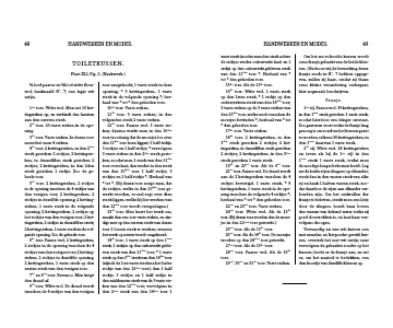 12de toer. Paarse wol. 3 vaste ste-ken; daarna werkt men in den 10den toer (zoodanig dat de moesjes los over den 11den toer heen liggen) 1 half stokje, 3 stokjes en 1 half stokje; * vervolgens 3 vaste steken in den 2den steek gesto-ken, zoodat men 1 steek van den 11den toer overslaat; dan weder in den steek van den 10den toer 1 half stokje, 3 stokjes en 1 half stokje *. Herhaal van * tot *. (Bij dezen toer zorge men, dat de stokjes, welke in den 10den toer ge-werkt worden, vooral regt over dien steek liggen, welke bij het werken van den 12den toer wordt overgeslagen.)
