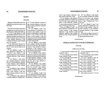 Deze kant wordt dwars gebreid, af-wisselend een toer regt en een toer vol-gens het patroon. Men zet 28 steken op.