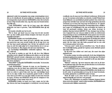 “Lady KATHARINA,” hernam de man op een flaauwen en somberen toon die het kind van schrik deed verstijven, “lady KATHARINA, de bedrieger komt; hij zal u zeggen dat hij een vorst en edele is: geloof him niet; leg uwe onschuldige hand niet in de zijne welke door baatzucht geleid wordt; er kleeft eene smet op de witte roos van zijn schild, de smet van verraad en logen. Dochter van HUNTLEY word niet de echtgenoot van den bedrieger, of wee uwer! wee! wee!”