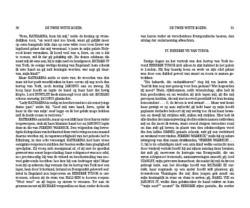 “Die lafaards, die ondankbaren!” riep hij ten laatste uit, “had ik dan nog niet genoeg voor hen gedaan? Wat begeerden zij meer? Titels, rijkdommen, zelfs vriendschap, alles heb ik hun geschonken en nu wenden zij zich tegen mij, zij die mij geroepen hadden, die mij met zooveel geestdrift tot hun koning benoemden! . . . O, de kroon is wel zwaar! . . . Maar wat komt haar gewigt er op aan; mylords! gij hebt haar op mijn hoofd geplaatst derhalve behoort zij mij wettig toe: ik zal haar bewa-ren en dewijl hij strijden wilt, zullen wij strijden. Hier heb ik alle draden der zamenzwering; slechts enkele namen ontbreken mij en die moet ik weten, want overal sluipen verraders rond en dan zult gij beven; in plaats van den edelmoedigen vorst die den laffen SIMNEL genade schonk, zult gij een verbitterd en wrekend vorst vinden. PERKINS WARBECK,” zeide hij op iedere lettergreep van dien naam drukkenden, “PERKINS WARBECK! . . . O, hij is de schuldigste niet! een arm kind welks eerzucht men door vleijerij verlokt heeft! hij zal zijnen misslag duur betalen; dat zult gij, mevrouw de hertogin van Bourgondië, die om uwen echtgenoot treurende, zamenzweringen smeedt; gij, lord STANLEY, mijn getrouwe kamerheer, die nadat hij mij de kroon gebragt hebt, aan het bloedige hoofd van RICHARD III ont- rukt, haar nogmaals op een ander hoofd wilt plaatsen; gij, trouwelooze Vlamingen die mij dien jongen gek zendt om mijn koningrijk in vuur en vlam te zetten; gij, KAREL VIII en JAKOBUS IV, welke dien gelukzoeker de hand reiktet en hem ““mijn neef”” noemt!” En HENDRIK zijne gestalte, die eerder