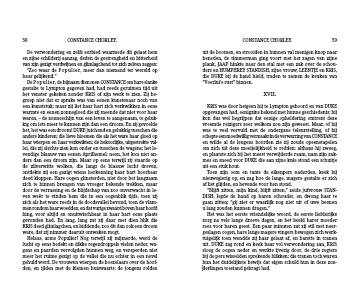 KRIS was door hetgeen hij te Lympton gehoord en van DUKE opgevangen had, eenigzins bekend met hunne geschiedenis; hij kon dus wel begrijpen dat eenige opheldering omtrent deze vreemde reizigers zeer welkom zou zijn geweest. Maar, of hij was te veel vervuld met de ondergane teleurstelling, of hij schepte een moedwillig vermaakt in de verwarring van CONSTANCE en wilde al de leugens hoorden zie zij zoude opeenstapelen om zich uit deze moeijelijkheid te redden; althans hij zweeg, en plaatste zich bij het meest verwijderde raam, nam zijn zak-mes en sneed voor DUKE die aan zijne knie stond een schuitje uit een stuk hout.
