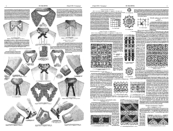in het volgende dubb. st., 3 kett., in den 2den hiervan 1 h. v. st., 2 kett., 1 v. st. in het midden van de 4 volgende kett., 3 kett., in den 2den hiervan 1 h. v. st., 2 kett. Van * af herhalen. De 2 volgende toeren worden aan de tegenovergestelde zijde van de rij bladeren gewerkt. ― 4de toer. * 2 dubb. st. door 1 pic. gescheiden, in den steek waar de beide vaste steken van