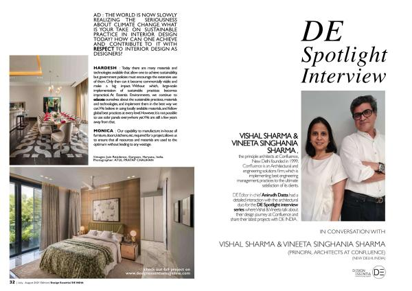 DE Editor in chief Anirudh Datta had a detailed interaction with the architectural duo for the DE Spotlight interview series where Vishal & Vineeta talk about their design journey at Confluence and share their latest projects with DE INDIA .