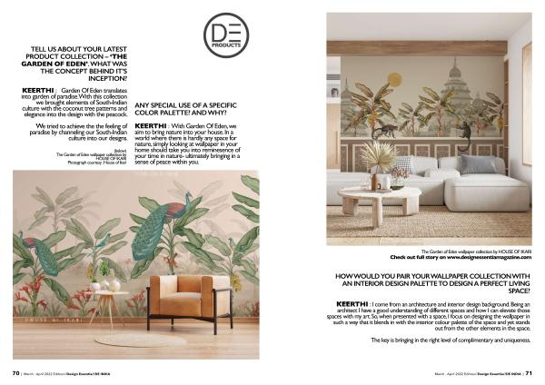 KEERTHI : With Garden Of Eden , we aim to bring nature into your house . In a world where there is hardly any space for nature , simply looking at wallpaper in your home should take you into reminesence of your time in nature- ultimately bringing in a sense of peace within you .