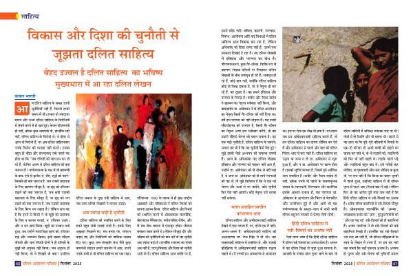 था । इस पर मेरा एक लेख भषी छपा है । दरअसल जब हम आंबेडकरवादषी साहितय कहते हैं, तो हम दलित साहितय का दायरा सषीवित कर देते हैं और आंबेडकर से पहले और बाद कषी दलित चिंतन-धारा से कट जाते हैं । दलित साहितय का उद्भव या जनि न तो डा. आंबेडकर से शुरू हुआ है, और न डा. आंबेडकर पर खति होता है । इसकषी सुदषीघ्व परमपरा है, जिसमें पूरषी अवैदिक धारा समाहित है । कबषीर और रैदास साहेब हषी नहीं, बसलक उनसे भषी पहले के समतामूलक समाज के सिप्नदशजी, शिलपकार और दार्शनिक इसके आधार-सतमभ हैं, यह परमपरा डा. आंबेडकर के आनदोलन और चिंतन से चेतनशषील और ऊर्जावान हुई है और आगे भषी यह वर्णवयिसथा के समूल-नाश में सभषी भािषी दलित-बहुजन नायकों से प्रेरणा लेतषी रहेगषी ।