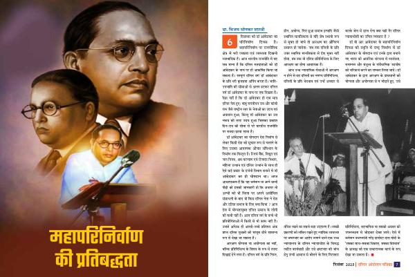 दिसमबर को डलॉ आंबेडकर का परिनिर्वाण दिवस है । महापरिनिर्वाण पर राजनषीवतक क्ेत् में भरषी वयग्ता एवं वयसतता दिखनषी सिाभाविक है । आज भारतषीय राजनषीवत में यह सब मानय है कि दलित मतदाताओं को डलॉ आंबेडकर के नाम पर हषी आकर्षित किया जा सकता है । समपूण्व दलित वर्ग डलॉ आंबेडकर के प्रति भरषी कृतज्ञता अर्पित करता है । जाति- उपजाति कषी सषीिाओं से अलग हटकर दलित वर्ग डलॉ आंबेडकर के नाम पर एक दिखता है । ऐसा नहीं है कि डलॉ आंबेडकर हषी एक मात् दलित नेता हुए । बाबू जगजषीिन राम और कांशषी राम जैसे राष्ट्रीय सतर के नेताओं का उदय एवं अवसान हुआ, किनतु डलॉ आंबेडकर का उस नछत् कषी तरह उदय हुआ जिसका प्रकाश दिन-रात कषी सषीिा से परे भारतषीय राजनषीवत पर सर्वदा छाया रहता है ।