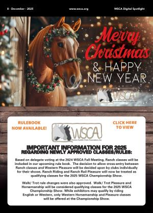 Walk / Trot rule changes were also approved. Walk / Trot Pleasure and Horsemanship will be considered qualifying classes for the 2025 WSCA Championship Show. While exhibitors may qualify by riding English or Western, only Western Horsemanship and Pleasure classes will be offered at the Championship Show.
