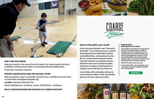 Coarse Italian is currently open 10:30 am-8:30 pm for indoor and outdoor dining , as COVID-19 mandates permit . We are open for carry-out , curbside pick-up and contactless delivery year round . Once the golf season comes to a close , Course Italian will be open Tuesday through Sunday for dinner service from 4-9 pm for dine-in , curbside pick-up and contactless delivery .