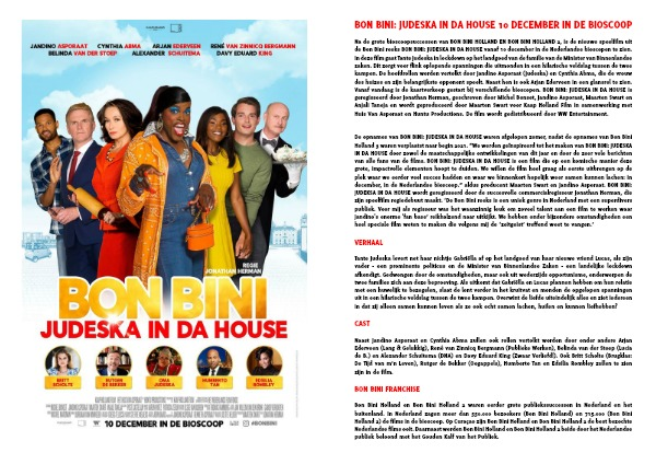 Na de grote bioscoopsuccessen van BON BINI HOLLAND EN BON BINI HOLLAND 2, is de nieuwe speelfilm uit de Bon Bini reeks BON BINI: JUDESKA IN DA HOUSE vanaf 10 december in de Nederlandse bioscopen te zien. In deze film gaat Tante Judeska in lockdown op het landgoed van de familie van de Minister van Binnenlandse zaken. Dit zorgt voor flink oplopende spanningen die uitmonden in een hilarische veldslag tussen de twee kampen. De hoofdrollen worden vertolkt door Jandino Asporaat (Judeska) en Cynthia Abma, die de vrouw des huizes en zijn belangrijkste opponent speelt. Naast hen is ook Arjan Ederveen in een glansrol te zien. Vanaf vandaag is de kaartverkoop gestart bij verschillende bioscopen. BON BINI: JUDESKA IN DA HOUSE is geregisseerd door Jonathan Herman, geschreven door Michel Bonset, Jandino Asporaat, Maarten Swart en Anjali Taneja en wordt geproduceerd door Maarten Swart voor Kaap Holland Film in samenwerking met Huis Van Asporaat en Huntu Productions. De film wordt gedistribueerd door WW Entertainment.
