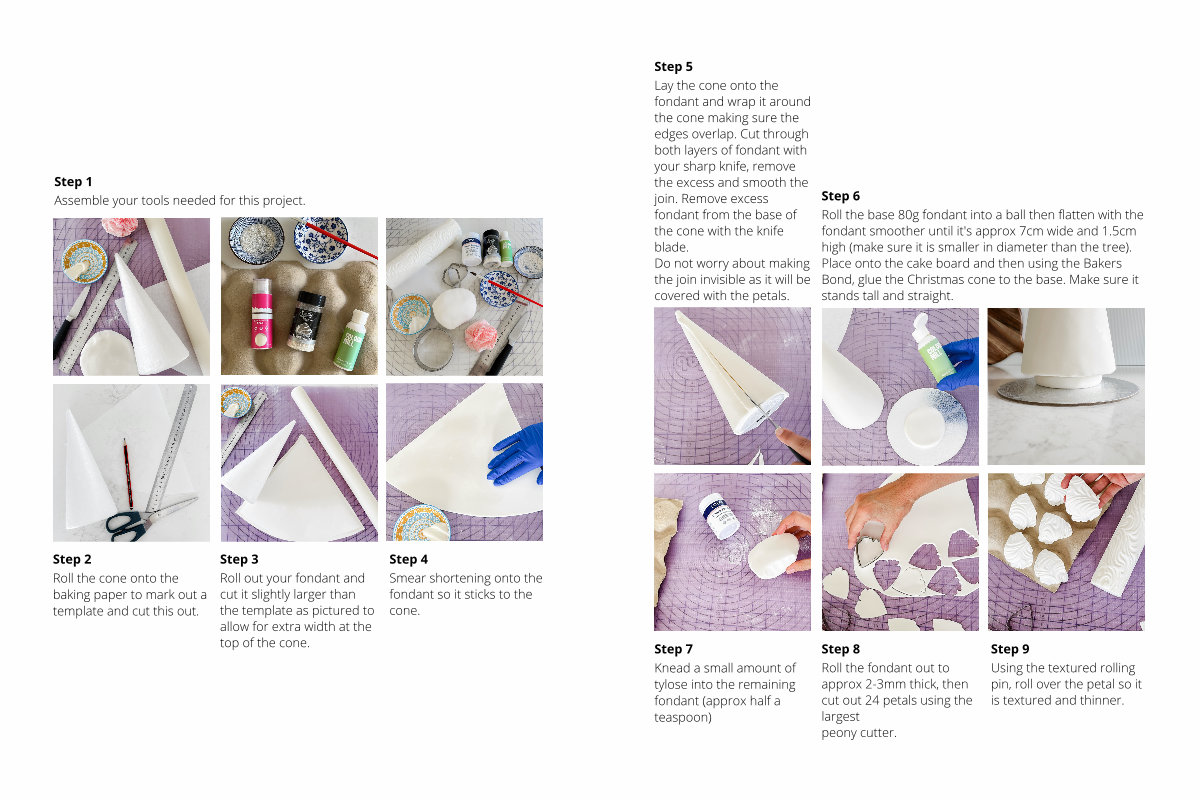 Roll the base 80g fondant into a ball then flatten with the fondant smoother until it ' s approx 7cm wide and 1.5cm high( make sure it is smaller in diameter than the tree). Place onto the cake board and then using the Bakers Bond, glue the Christmas cone to the base. Make sure it stands tall and straight.