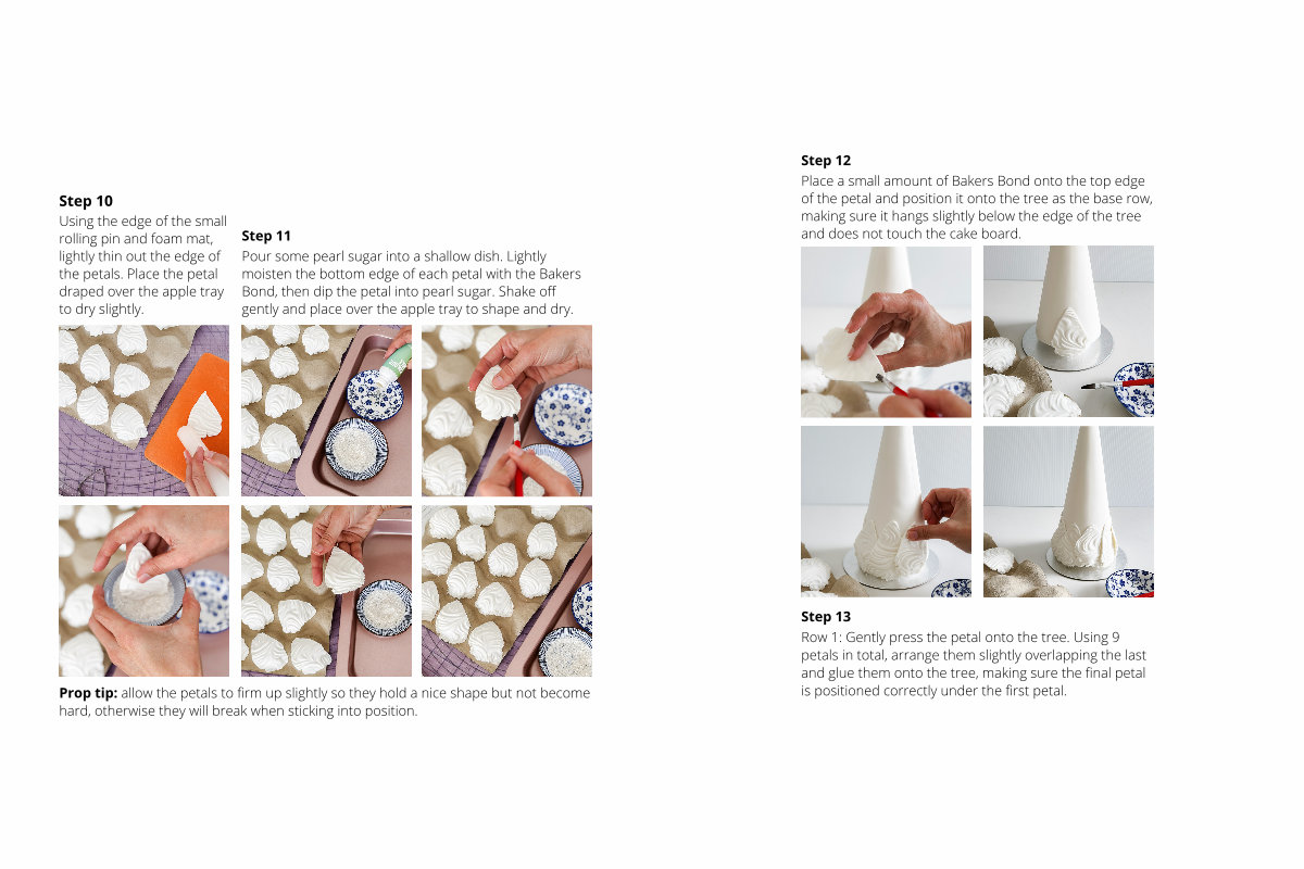 Step 12 Place a small amount of Bakers Bond onto the top edge of the petal and position it onto the tree as the base row, making sure it hangs slightly below the edge of the tree and does not touch the cake board.