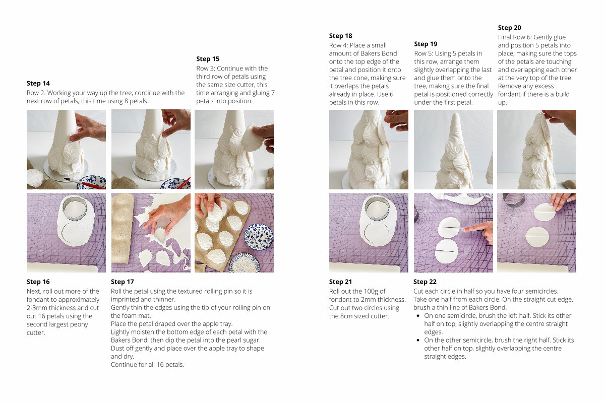 Step 20 Final Row 6: Gently glue and position 5 petals into place, making sure the tops of the petals are touching and overlapping each other at the very top of the tree. Remove any excess fondant if there is a build up.