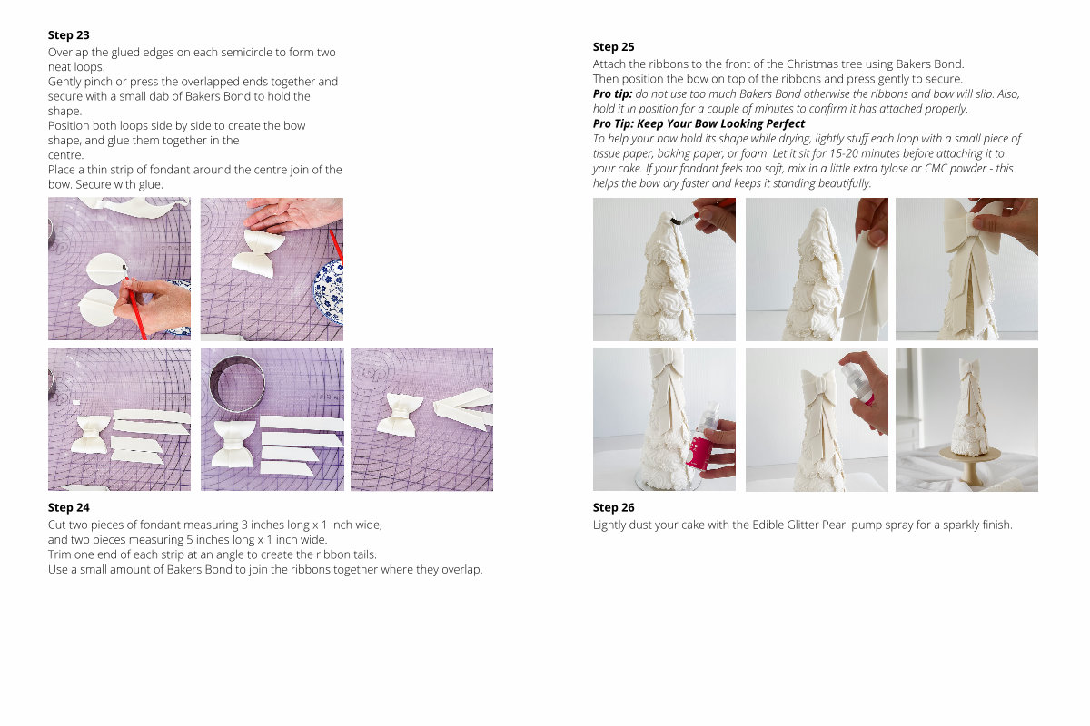 Attach the ribbons to the front of the Christmas tree using Bakers Bond. Then position the bow on top of the ribbons and press gently to secure. Pro tip: do not use too much Bakers Bond otherwise the ribbons and bow will slip. Also, hold it in position for a couple of minutes to confirm it has attached properly. Pro Tip: Keep Your Bow Looking Perfect To help your bow hold its shape while drying, lightly stuff each loop with a small piece of tissue paper, baking paper, or foam. Let it sit for 15-20 minutes before attaching it to your cake. If your fondant feels too soft, mix in a little extra tylose or CMC powder- this helps the bow dry faster and keeps it standing beautifully.