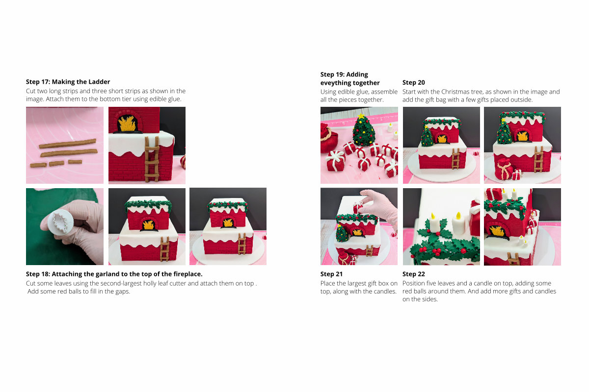 Step 22 Position five leaves and a candle on top, adding some red balls around them. And add more gifts and candles on the sides.