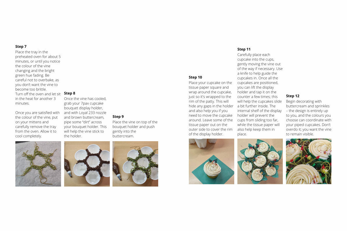 Step 12 Begin decorating with buttercream and sprinkles – the design is entirely up to you, and the colours you choose can coordinate with your piped cupcakes. Don’ t overdo it; you want the vine to remain visible.