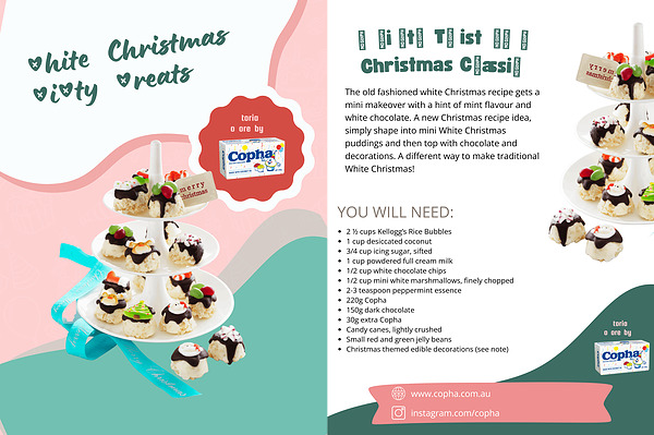 The old fashioned white Christmas recipe gets a mini makeover with a hint of mint flavour and white chocolate. A new Christmas recipe idea, simply shape into mini White Christmas puddings and then top with chocolate and decorations. A different way to make traditional White Christmas!