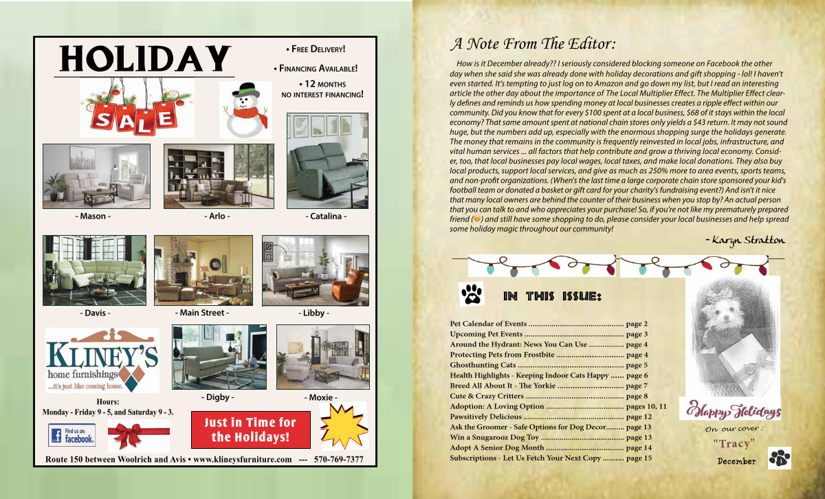 Pet Calendar of Events.............................................. page 2 Upcoming Pet Events................................................ page 3 Around the Hydrant: News You Can Use.................. page 4 Protecting Pets from Frostbite............................... page 4 Ghosthunting Cats................................................. page 5 Health Highlights- Keeping Indoor Cats Happy...... page 6 Breed All About It- The Yorkie.............................. page 7 Cute & Crazy Critters............................................... page 8 Adoption: A Loving Option...................................... pages 10, 11 Pawsitively Delicious................................................ page 12 Ask the Groomer- Safe Options for Dog Decor......... page 13 Win a Snugarooz Dog Toy........................................ page 13 Adopt A Senior Dog Month..................................... page 14 Subscriptions- Let Us Fetch Your Next Copy.......... page 15