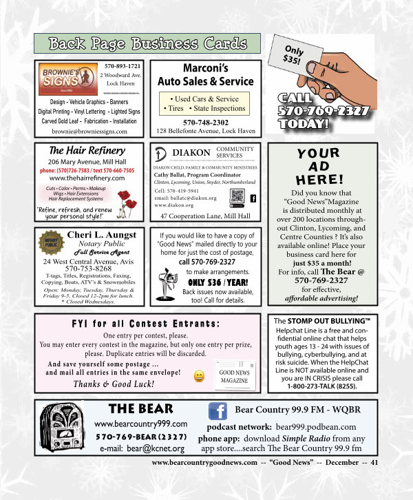 Did you know that“ Good News” Magazine is distributed monthly at over 200 locations throughout Clinton, Lycoming, and Centre Counties? It’ s also available online! Place your business card here for just $ 35 a month! For info, call The Bear @ 570-769-2327