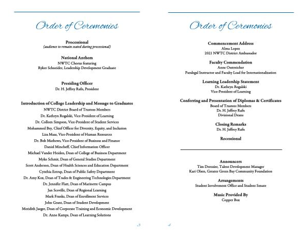 Introduction of College Leadership and Message to Graduates NWTC District Board of Trustees Members Dr . Kathryn Rogalski , Vice-President of Learning Dr . Colleen Simpson , Vice-President of Student Services Mohammed Bey , Chief Officer for Diversity , Equity , and Inclusion Lisa Maas , Vice-President of Human Resources Dr . Bob Mathews , Vice-President of Business and Finance Daniel Mincheff , Chief Information Officer